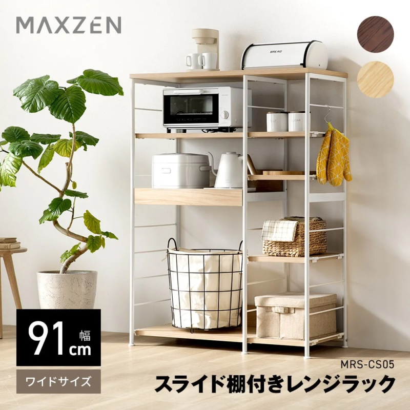 本製品は、幅約60cmと30cmの棚を組み合わせた幅91cmのワイド設計により、大型レンジも余裕をもって配置できる収納スペースを提供します。家電製品が多いキッチンにおいて、これ1台で多様な収納ニーズに対応可能です。