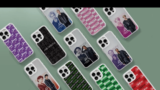 複数のiPhone用透明ケースが並べられており、それぞれに異なるカラフルなデザインやロゴが施されています