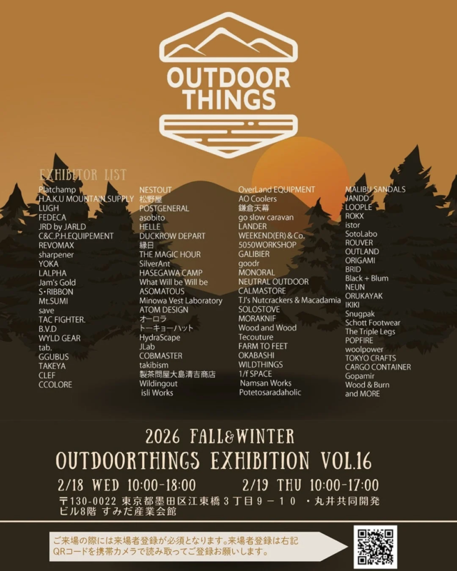 「OUTDOOR THINGS EXHIBITION VOL.16」は、バイヤー、業界関係者、メディア関係者を対象とした展示会です。一般の方の来場はご遠慮いただいております。また、会場での製品販売は行われません。来場登録は不要ですが、当日受付にて名刺の提出が必要です。
