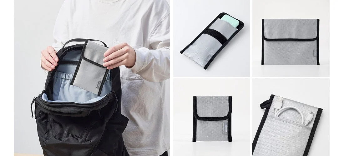 モバイルバッテリーなどのガジェットを収納し、持ち運びに便利なサイズです。飛行機内へのモバイルバッテリー持ち込み時など、バッグにすっきりと収まります。移動時だけでなく、自宅でのモバイルバッテリーやケーブルの保管ポーチとしても利用可能です。