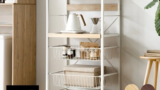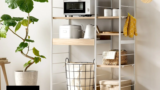 木目調とスチールの異素材の調和が空間に美しく映える、洗練されたシンプルなデザインです。キッチンだけでなく、リビングのディスプレイラックやブックシェルフ、ランドリーラックなど、様々な場所での活用が期待されます。