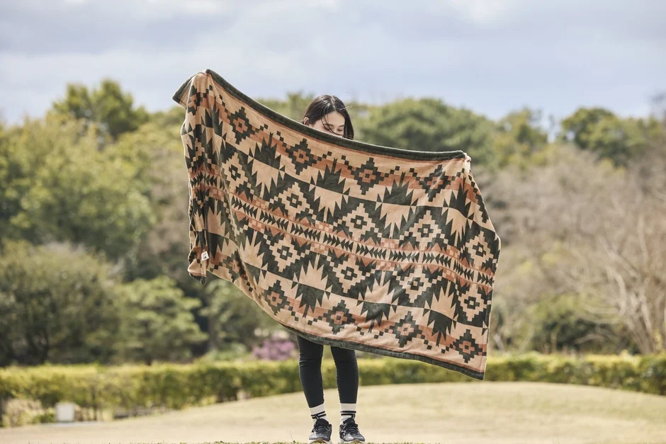 幾何学模様のエスニック柄ブランケットを広げる女性が、屋外の広々とした草原に立っています。顔はブランケットで隠れており、背景には木々が見えます。